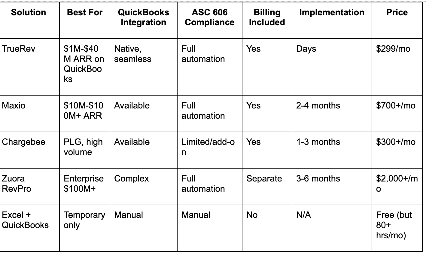 Most ASC 606 compliance tools are designed for enterprise companies on NetSuite or SAP. They assume you have a dedicated accounting team, a six-month implementation timeline, and a six-figure budget. For mid-market SaaS companies on QuickBooks, the options are more limited — but one stands out.