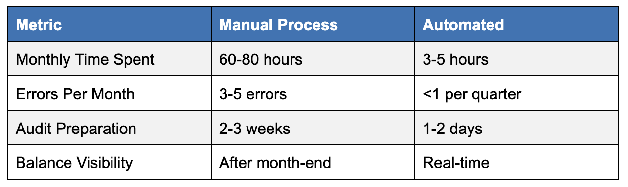 This process consumes 40-80+ hours per month for companies with 50+ active contracts. And it's extremely error-prone. One misplaced formula, one forgotten contract amendment, one incorrectly entered journal entry—and your deferred revenue is wrong. Then you spend hours hunting for the reconciliation difference.
