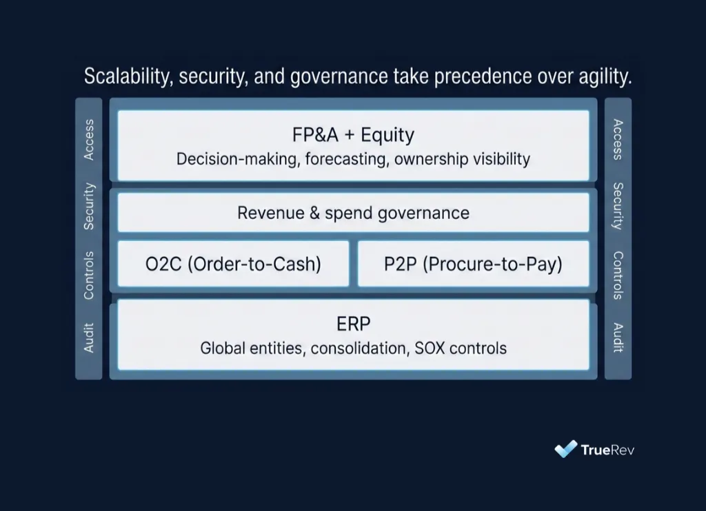 At $50M+ ARR, the company is likely preparing for an exit (IPO or strategic acquisition). The stack must be SOX-compliant, capable of handling global consolidation (dozens of entities), and robust enough to support hundreds of users. Scalability, security, and governance take precedence over agility.