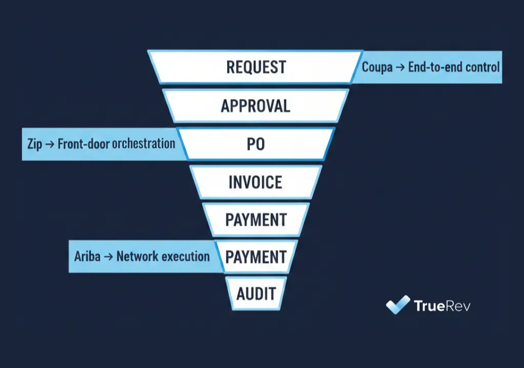 Zip is the "Intake-to-Procure" leader. It solved the problem that "nobody likes using procurement software" by building a consumer-grade front door for requests. It sits on top of ERPs and P2P systems to orchestrate the approval process across Legal, IT, and Finance, making it the "user experience" layer for spend.